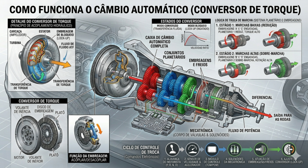 Conversor de Torque: Substitui a embreagem, transferindo a força do motor para a caixa via fluido.