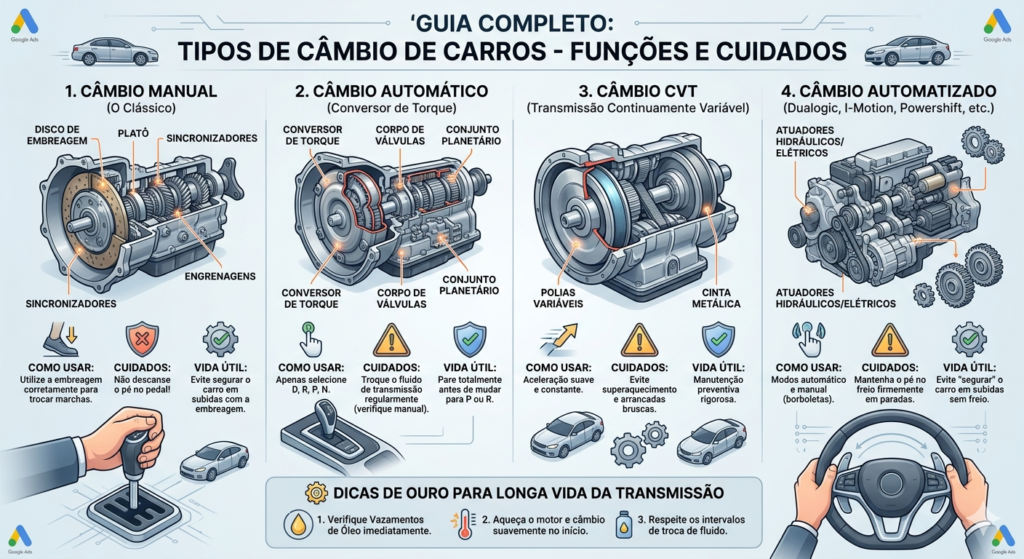 Se você está em dúvida entre câmbio manual, automático ou CVT, este guia vai te mostrar qual realmente compensa em 2026 — sem enrolação.