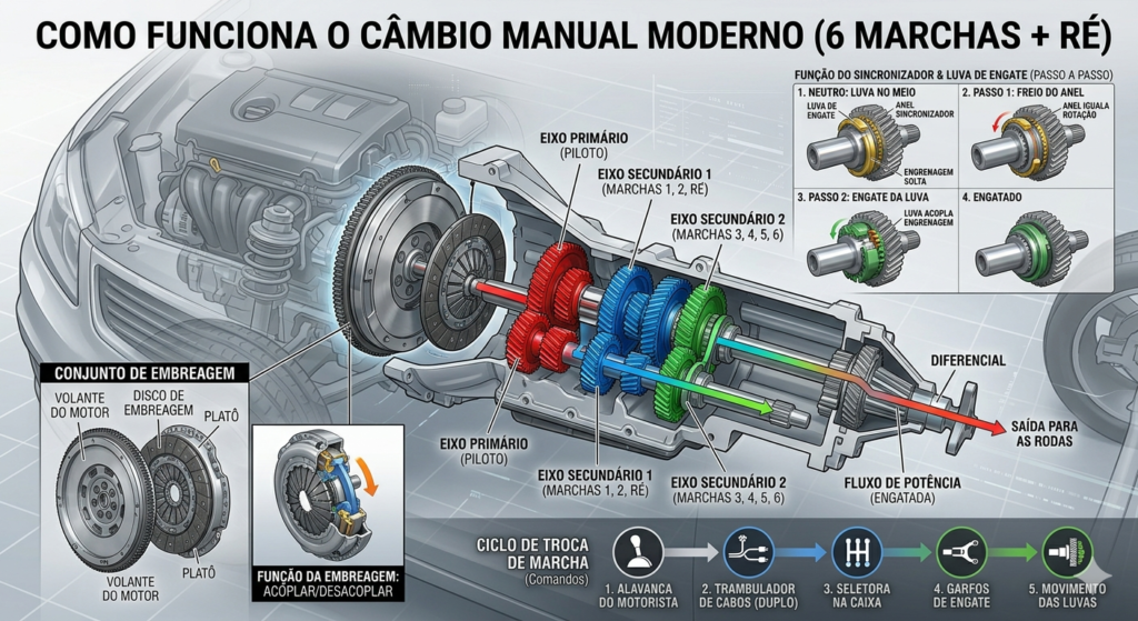 Sincronizadores: Permitem que as engrenagens se encaixem suavemente sem “arranhar”.